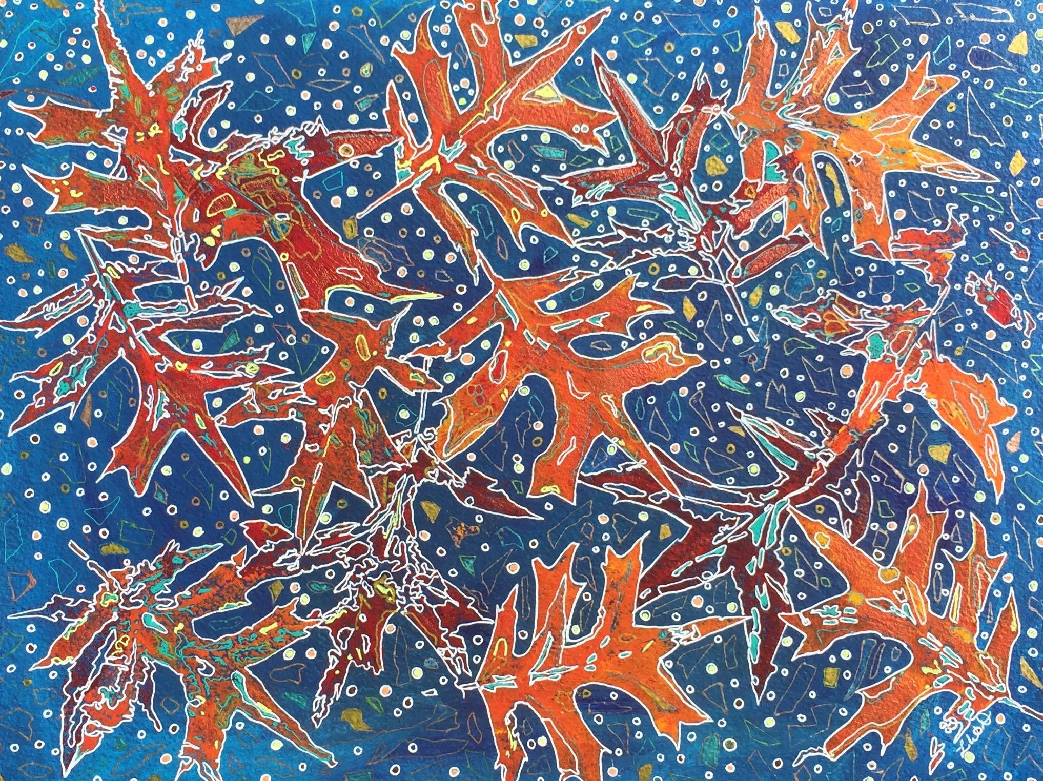My seventy year old oak trees in the front of my house was a huge part of the beauty that came with our house when we bought it 10 years ago. During the seasonal changes these trees always inspire me. It takes these old oak trees much longer in the fall to loose their leaves. This also means many hours of raking and bagging leaves. This is just part of having beautiful old oak trees. Winter comes and my trees are bare and it almost adds a since of gloom along with the chilly weather. Spring comes along and the tiniest vivid green leaves start sprouting on my trees. This is always a reminder that life contiunes and I always feel a since of renewal. This spring will start a new journey in my life. When May arrives I will be retiring from a 36 year career of teaching art to many young people in Oklahoma. During the hot summer while my trees shade the house the acorns that the squirrels buried during the winter will start sprouting young oak trees. Fall will arrive again and I will enjoy the fall weather and watching my old oak trees.