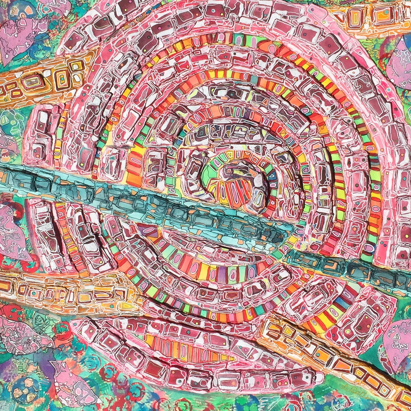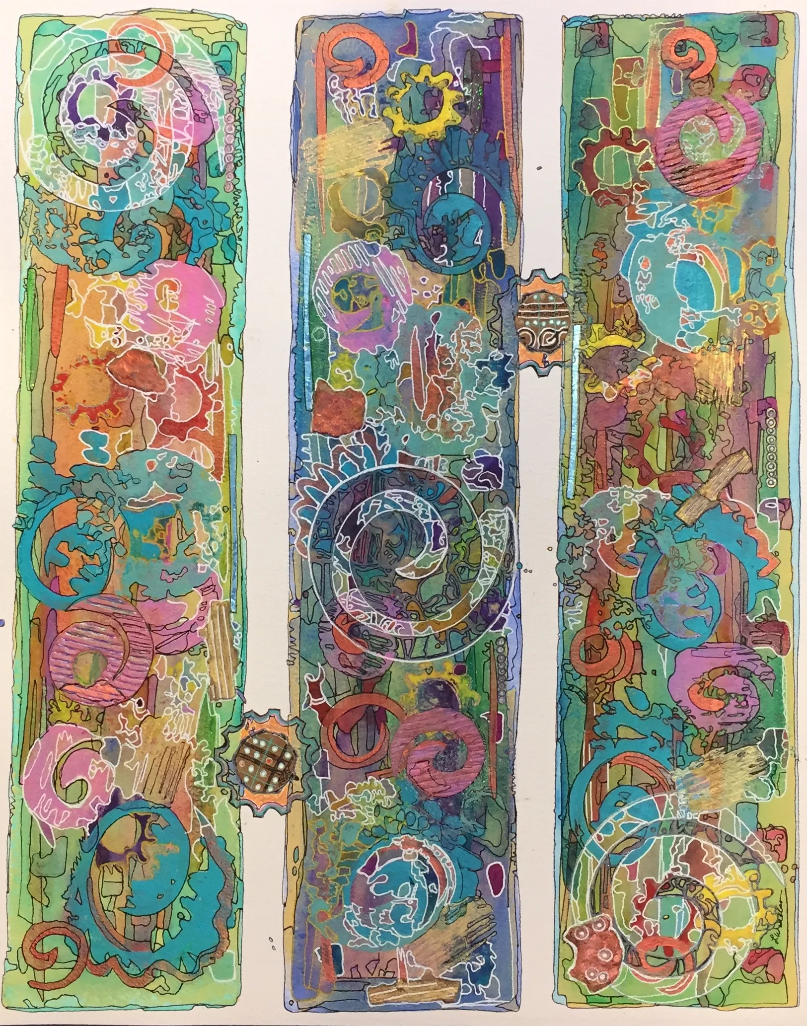 "Spirals In A Landscape" was done on aquarelle arches 300lb. cold press. I used watercolors,acrylic, coffee sleeves, and ink. I printed the rectangles with a thicker paint and let them dry. I then added many layers of watercolor on top of the rectangles. I hand cut different images and print them inside of the rectangles. I added three spirals made of coffee sleeves and put one in each rectangle. I use several different ink pens to outline the shapes and spaces.