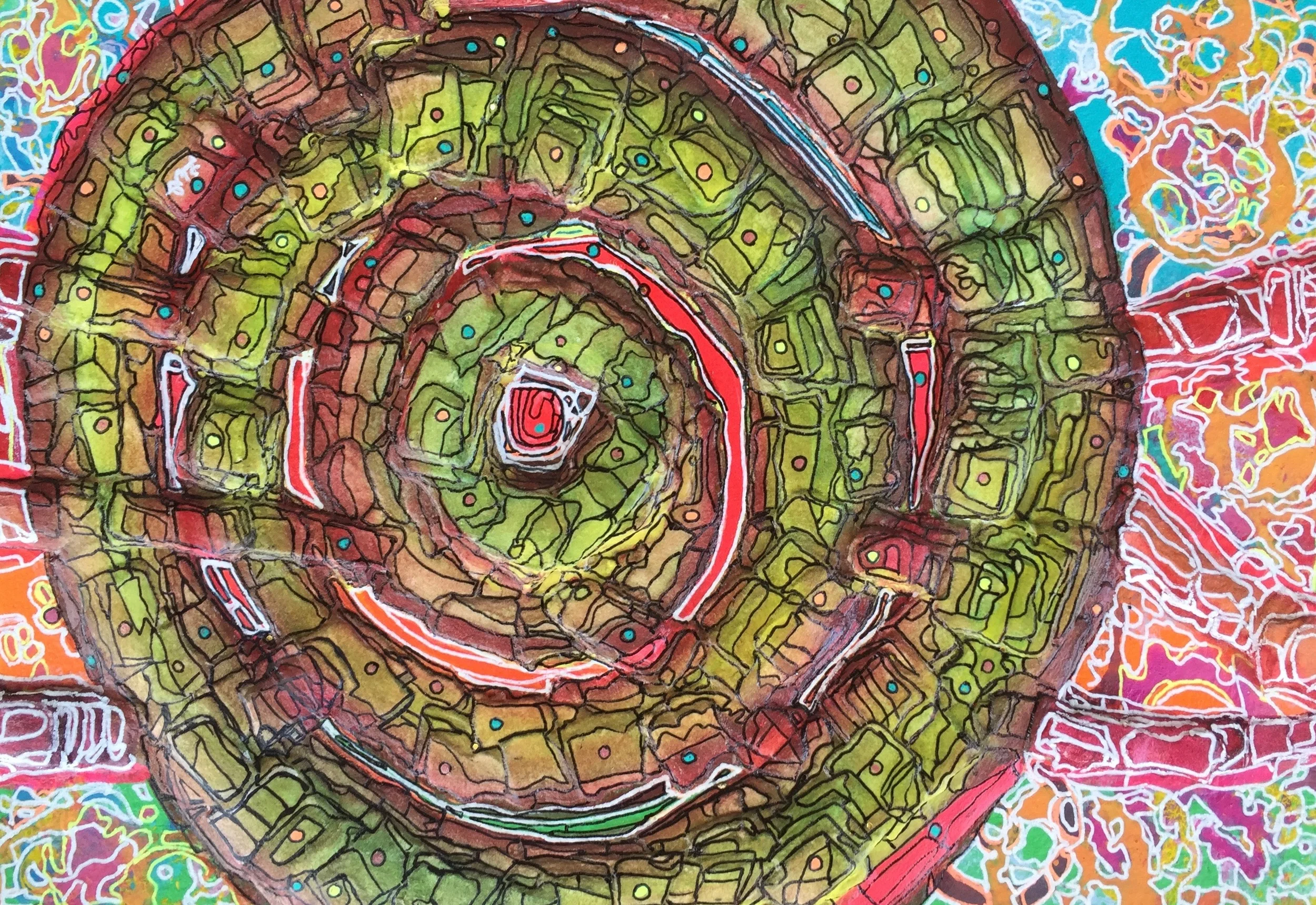 This "Straw Wattle" is "22x"22. This is my largest straw wattle I have made. I painted the edges by blending bright colored watercolor and fluid acrylic. I printed the design on top of the watercolor with the bottom of a spool of thread and outlined the shapes with white ink. I water colored the space between the wattle with bright colors using brush strokes. I outlined the brush strokes with white ink. The white wattle was build up using many layers of BFK Rives paper. I hand tore all of the pieces of the white paper in a variety of sizes. I then started forming the wattle on top of aquarelle arches 300lb. paper and gluing down the torn paper. I accented a few of the torn pieces with a peach colored water color and a ink around those pieces with peach colored ink. After I had the torn paper the thickness I wanted I water colored it a light aqua. I inked around all of the torn paper with black ink. I then added tiny colored dots on top of the wattle. The wattles are exciting to make because I never know what spiral shape I will end up with.